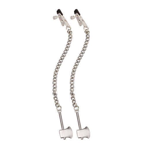 Grampos para seios em metal com estimulador de mamilos ajustável onde há a possibilidade de rosquear e diversificar a pressão desejada, intensificando o relacionamento com momentos mais excitantes. Possui corrente e peso na extremidade com formato de machadinha. Estes grampos para seios podem elevar sua vida sexual a um patamar inesperado pois são muitas as fantasias que incluem fetiche com seios. Experimente!